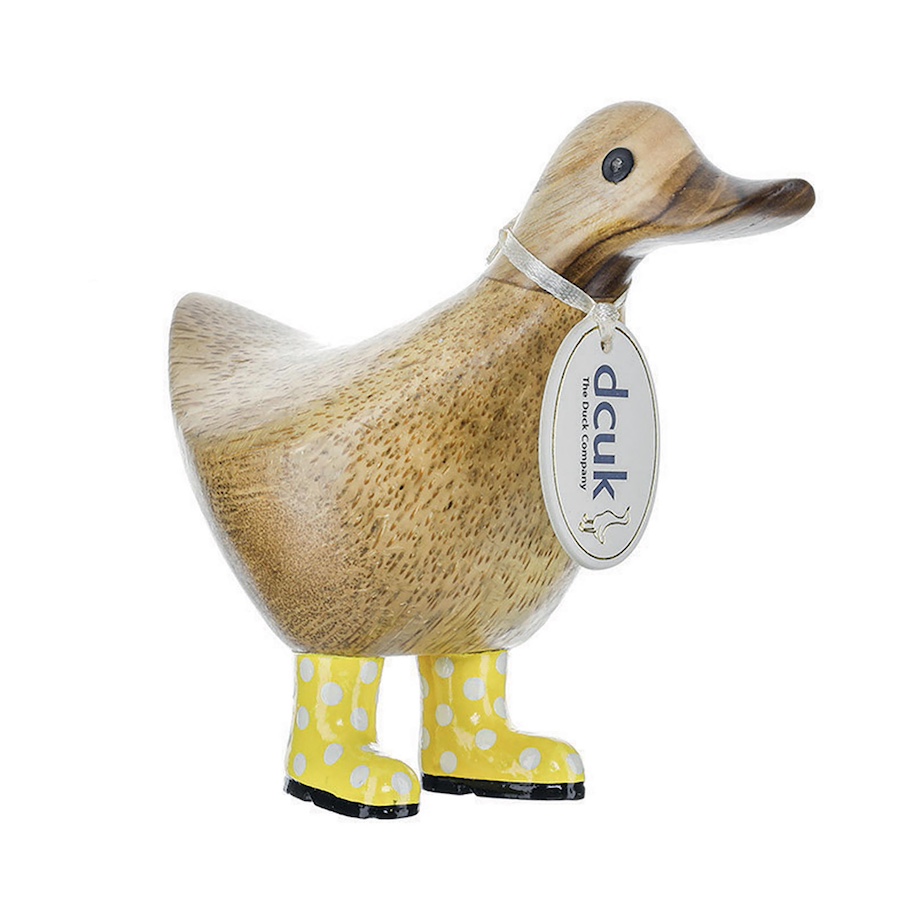 This adorable DCUK Ducky With Yellow Spotty Welly Boots, comes in a natural finish with coloured wellies. The ducks are hand carved and painted, giving them their own unique individual character and personality.