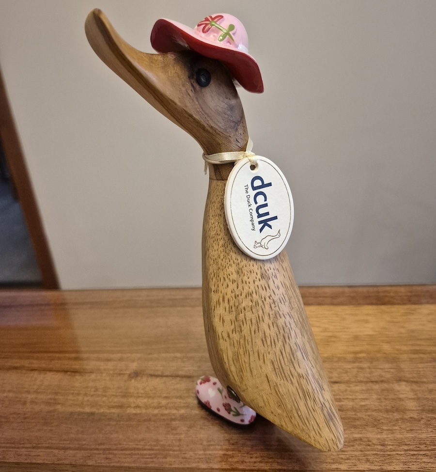 This adorable Floral Welly Ducklings Pink With Hat 1 comes in a natural finish and floral coloured wellies. The ducks are hand carved and painted, giving them their own unique individual character and personality.