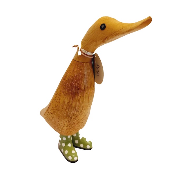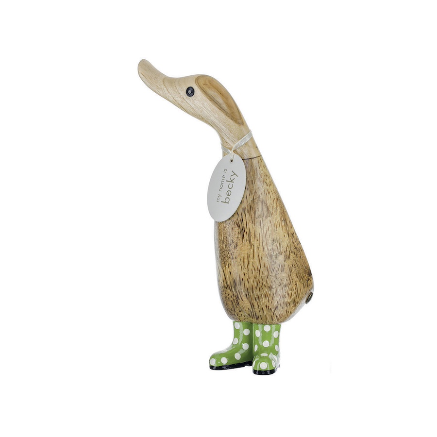 This adorable Natural Welly Ducklings Spotted Green comes in a natural finish and polka dotted coloured wellies. The ducks are hand carved and painted, giving them their own unique individual character and personality.
